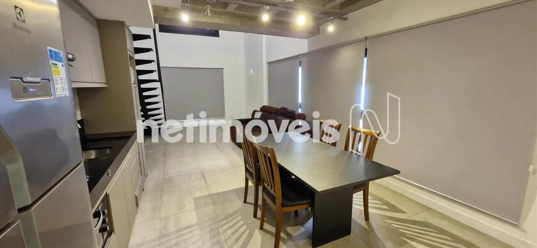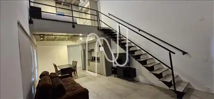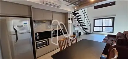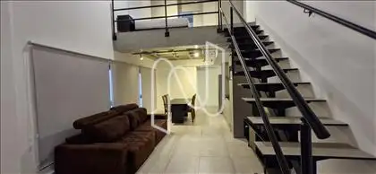 Apartamento tipo studio, sendo: 1º piso 01 salão amplo com sala de visitas, sala de jantar e cozinha montada, ar condicionado.; 01 lavabo; 2º piso 01 suíte com ótimos armários, banheiro montado e ar condicionado.