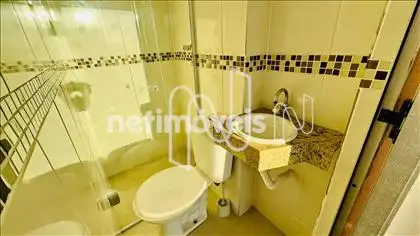 * 01 Banheiro social com armário, box em vidro temperado, espelho e piso em cerâmica.